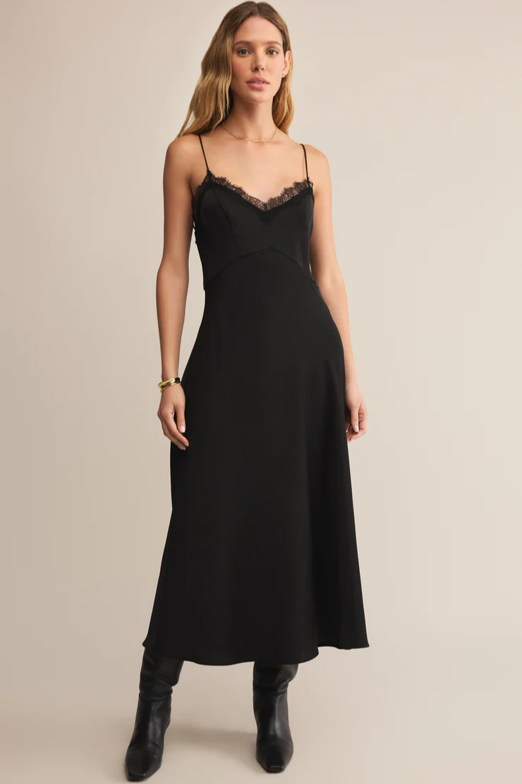 Romantic and refined, this satin midi dress features a v-neckline, lace trim, and delicate spaghetti straps. The adjustable tie back adds a personalized touch for your most comfortable fit yet.