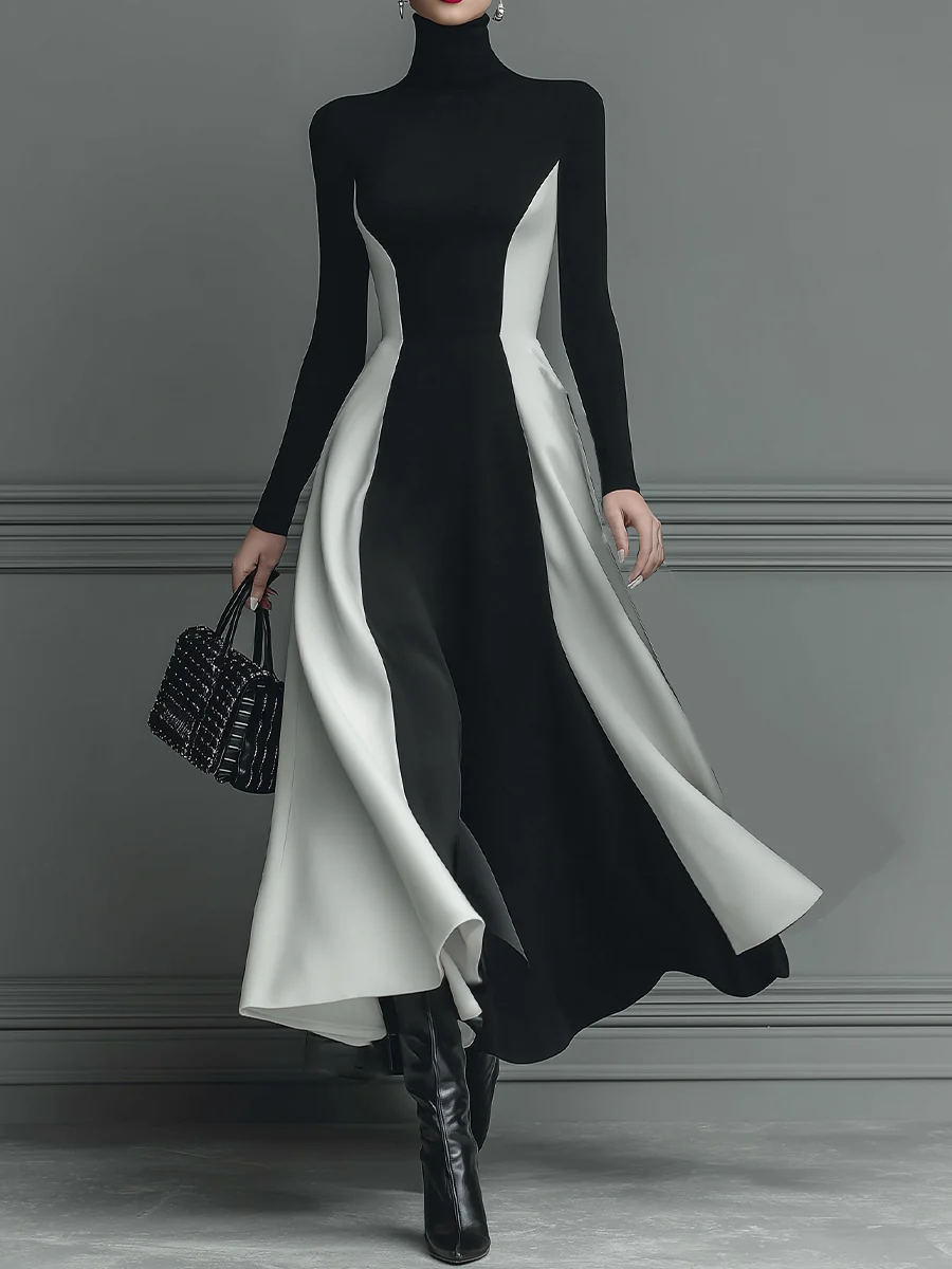 A striking black and white knitted maxi dress with bold stitching, featuring a fluid silhouette for elegant movement.