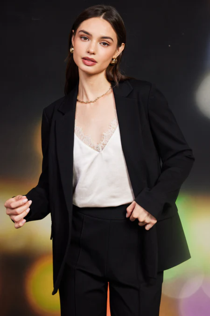 Effortlessly tailored yet endlessly versatile, the Knit Sleeve Blazer is your modern take on classic suiting. Cut in a sleek black hue, this piece combines a structured silhouette with the comfort of knit sleeves for a refined-meets-relaxed look. Designed with a single-breasted front, notched lapels, and clean lines, it layers seamlessly over camisoles, blouses, or tees—perfect for workdays, evenings out, and everything in between.
