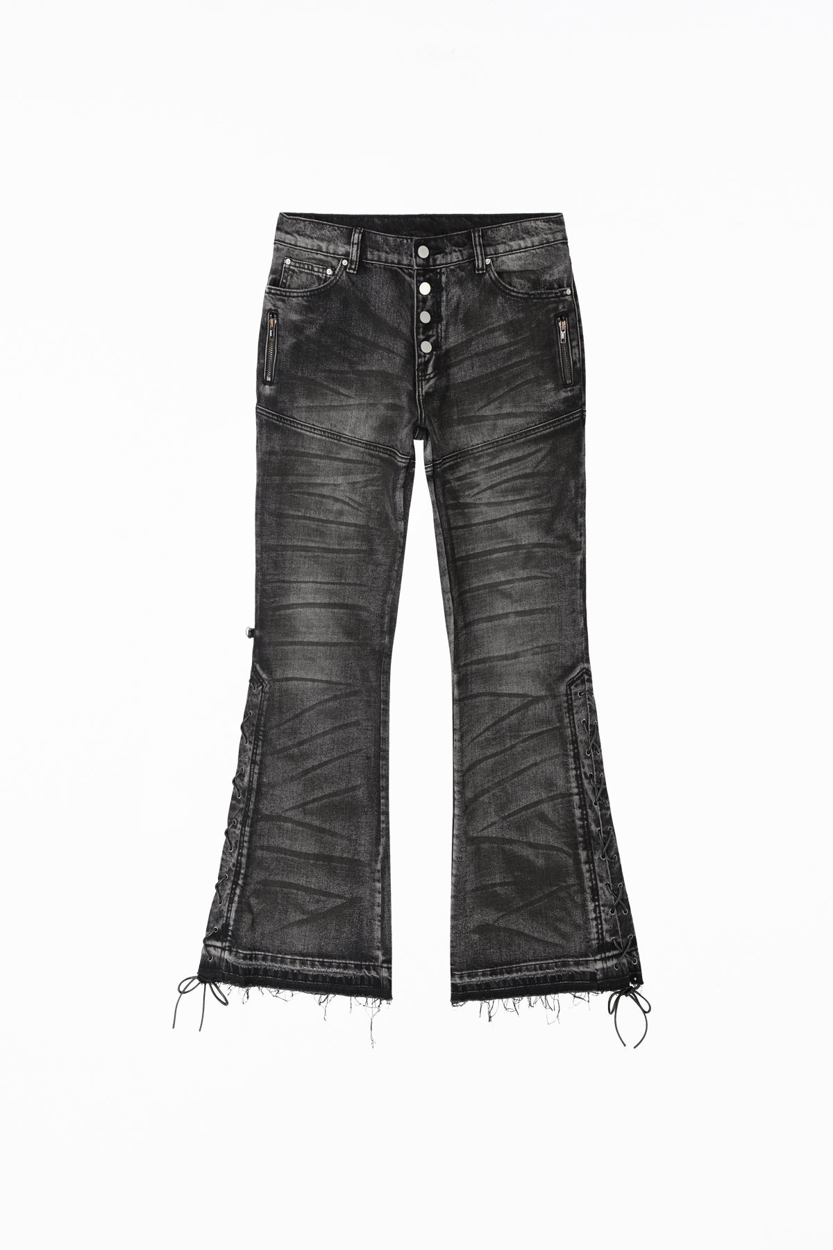 Denim jeans with tiger stripes & fading all over front and back. Washed denim & distressed bottom hem. Lacing on both legs.