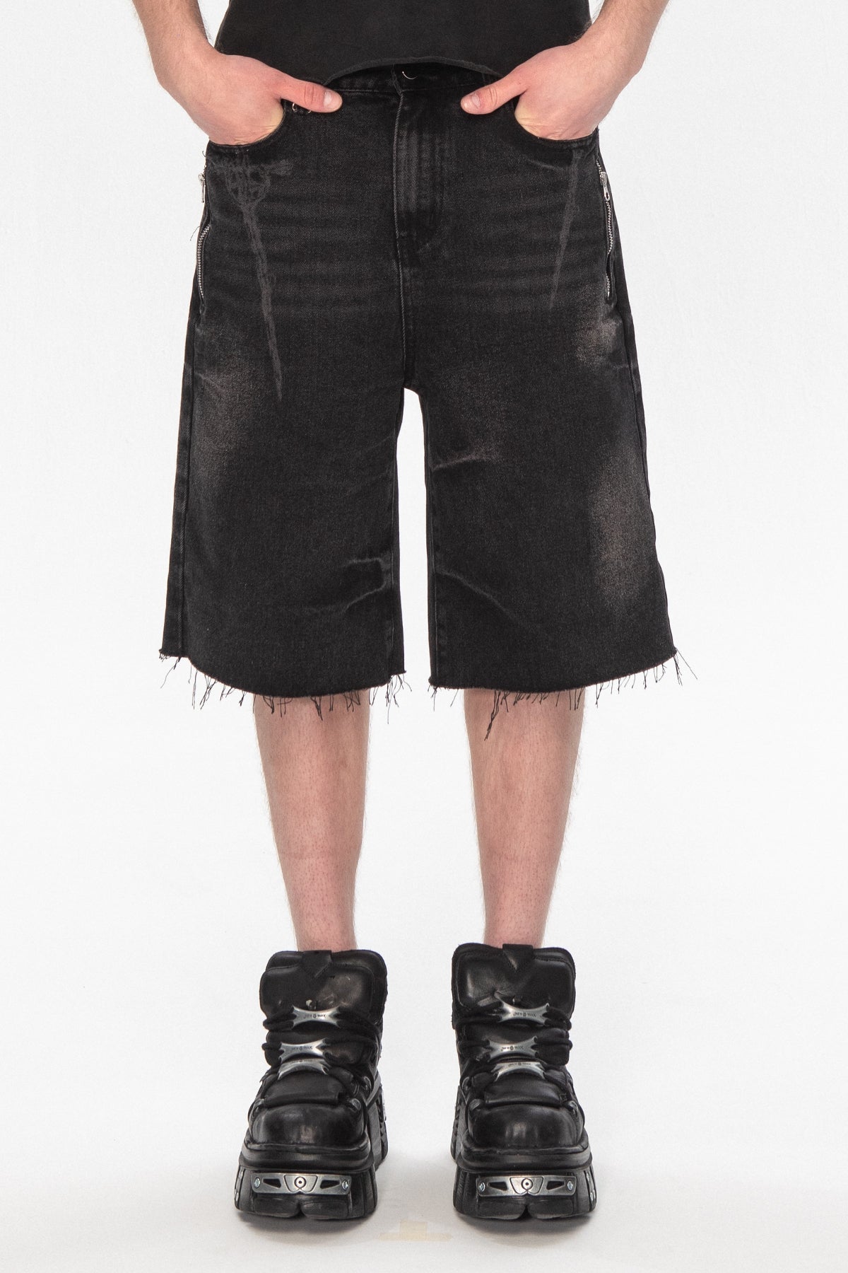 These shorts feature laser-engraved dagger graphics and fading across the front and back, with subtle whiskering and distressed/frayed hems.