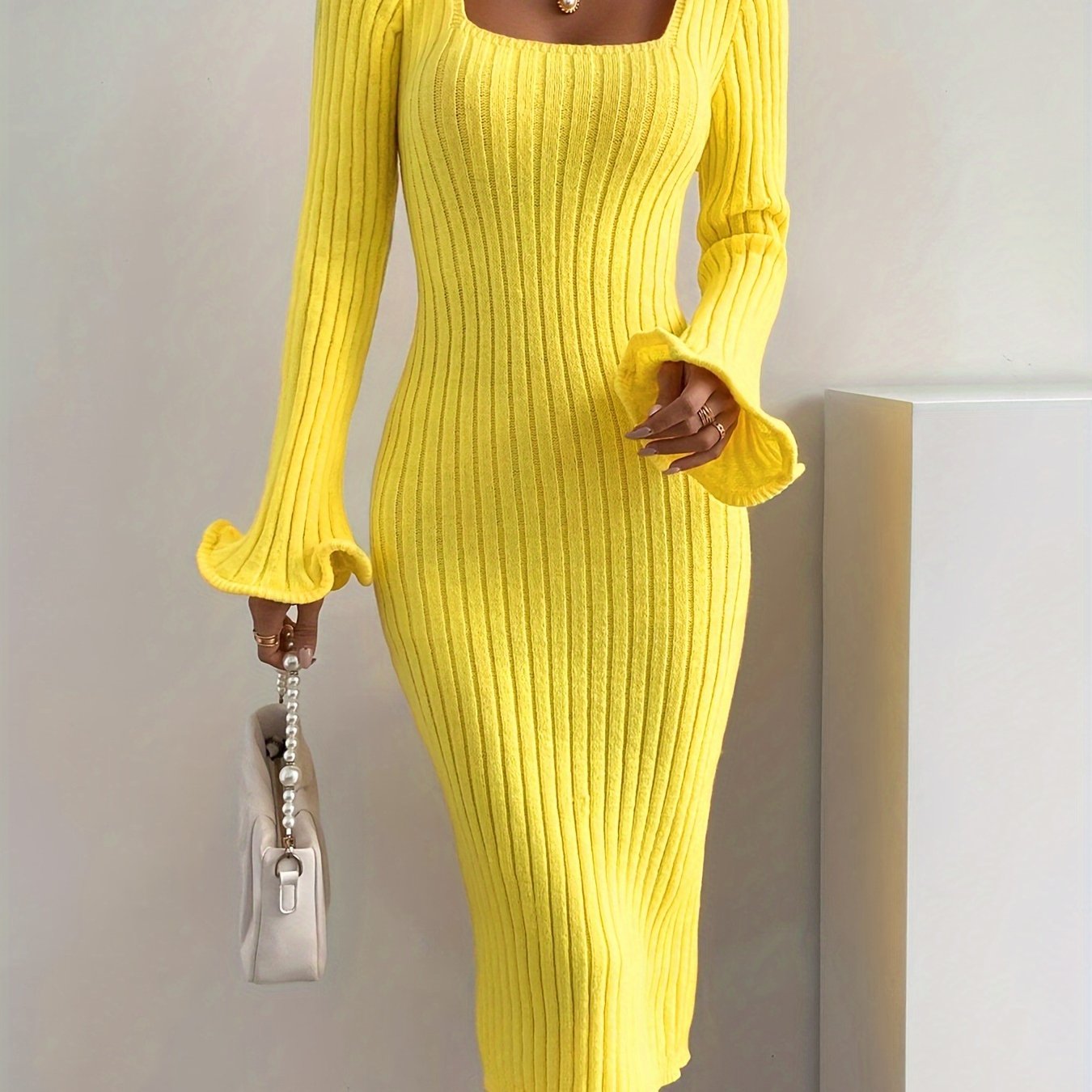 Elegant Ribbed Knit Bodycon Sweater Dress with Lettuce Trim Fluted Sleeves and Square Neckline - Acrylic Blend, Solid Pattern, Middle Eastern Style