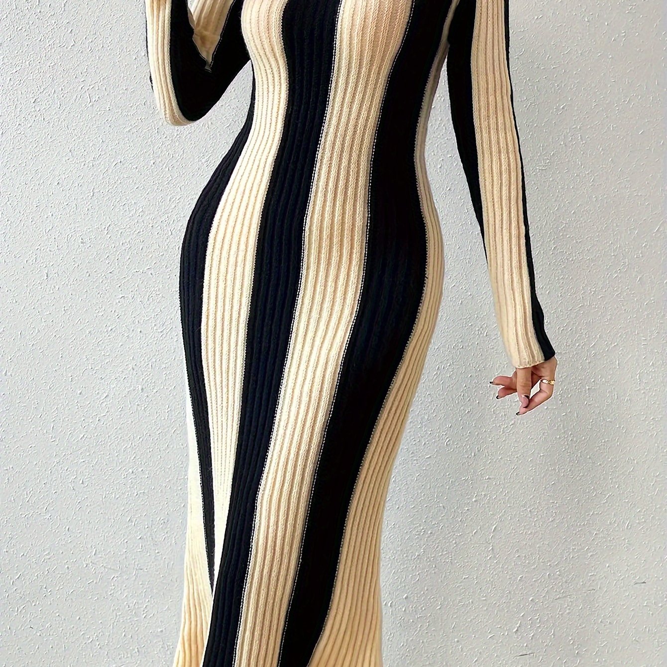 Elegant Striped Bodycon Dress | Fall\u002FWinter Chic Long Sleeve Color Block - Rib-Knit, Crew Neck, Warm Acrylic Blend