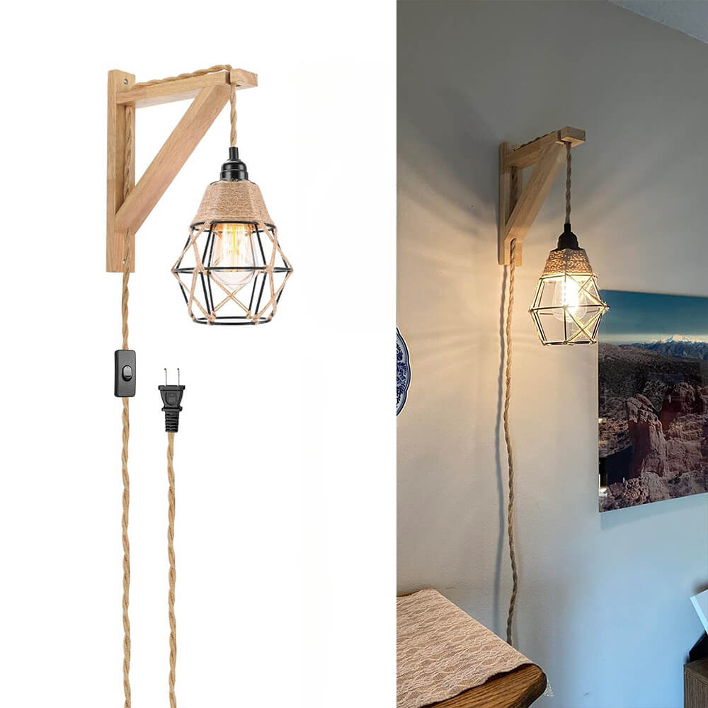 Brighten up your home with the Farmhouse Rustic Wall Sconce, which features a black metal cage shade wrapped in hemp rope. The unique design adds elegance to the entire space, perfectly complementing your farmhouse or country decor.