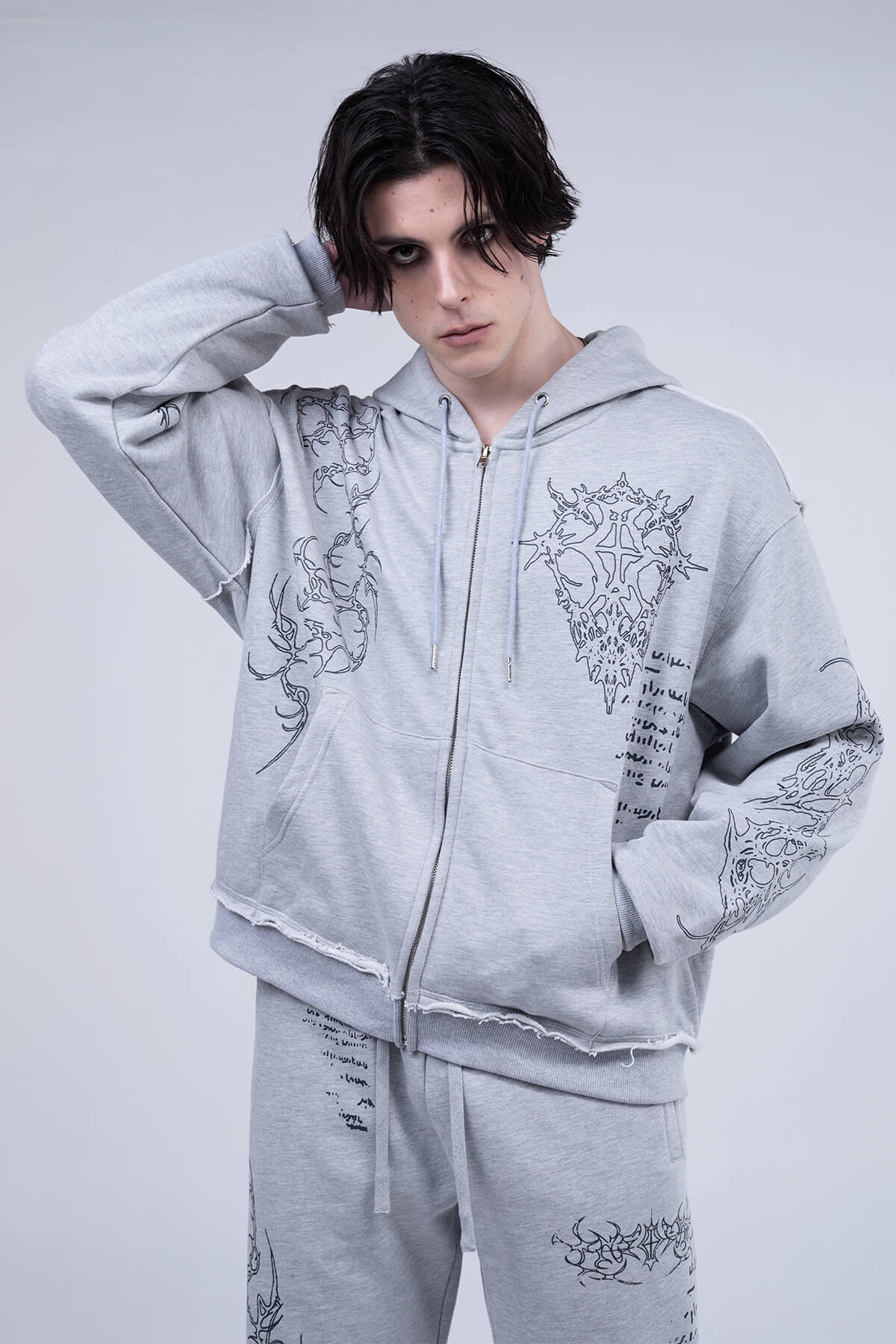 Denim jeans with tiger stripes & fading all over front and back. Washed denim & distressed bottom hem. Lacing on both legs.