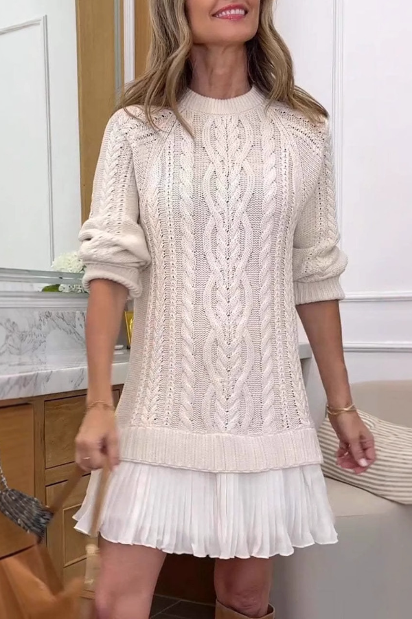 Knit Cable Textured Long Sleeve Pleated Chiffon Hem Sweater Mini Dress
