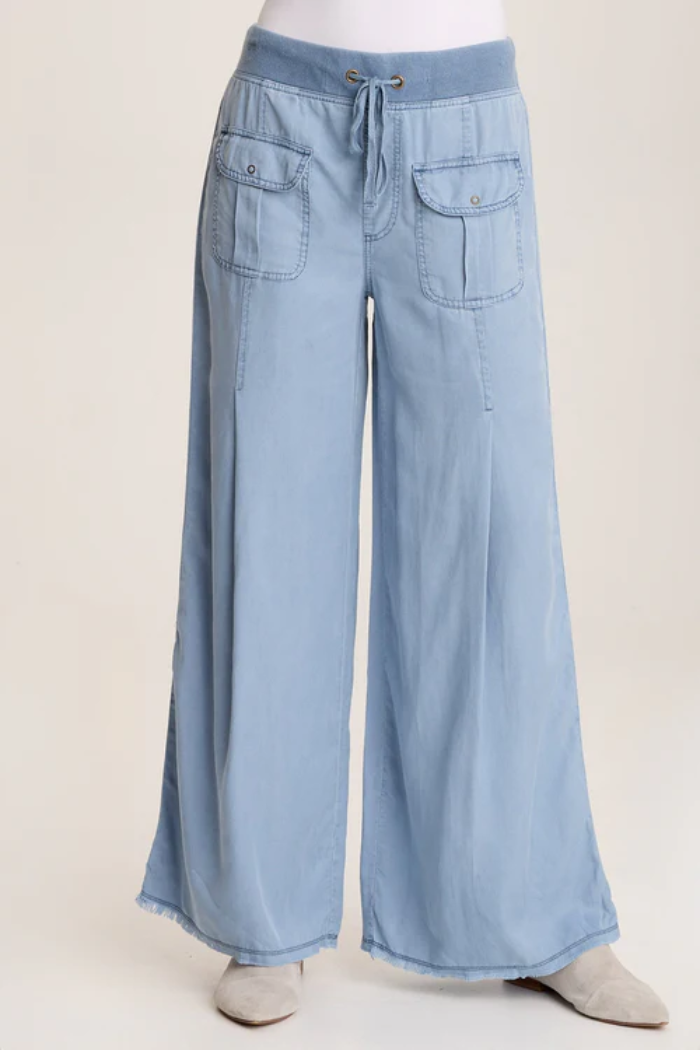 Smooth soft twill takes this wide-leg, raw-edge hem trouser up a notch. An elastic drawstring waist, voluminous pleating, and flapped front pockets keep things cute and cozy!