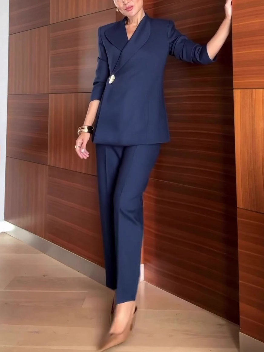 Metis Suit Set: Refined tailoring with a structured jacket and precision-cut trousers. This coordinated ensemble creates a polished silhouette—ideal for formal and professional settings, blending timeless sophistication with quality craftsmanship.