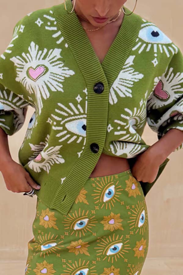 - We loved our secret cardigan, so we're bringing back the same structured silhouette in a new print! This knit fabric is soft to the touch, yet has a rich, huggy feel that's perfect for this season. It features our signature eye and heart pattern for a striking look.