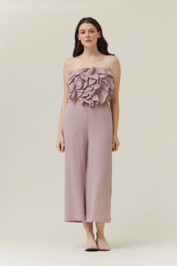 Elevate your effortless style with the Rainey Ruffle Gauze Jumpsuit, where playful texture meets understated elegance. This strapless silhouette features a cascade of soft, sculptural ruffles across the bodice, adding dimension and flair to a relaxed yet flattering fit. Crafted from breathable gauze fabric, it flows into wide-leg pants that offer ease of movement and a breezy feel, perfect for warm days or evening gatherings. Whether styled with sandals for a casual look or heels for a night out, the Rainey is your go-to piece for comfort, confidence, and a touch of romantic charm.