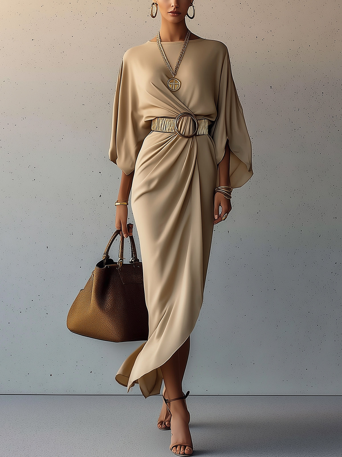 Design: This elegant midi dress features a sophisticated batwing sleeve design and a flowing silhouette accented by a wide elastic belt with a bold circular buckle. Subtle pleating at the waist enhances fluid movement and adds a touch of refined intrigue.