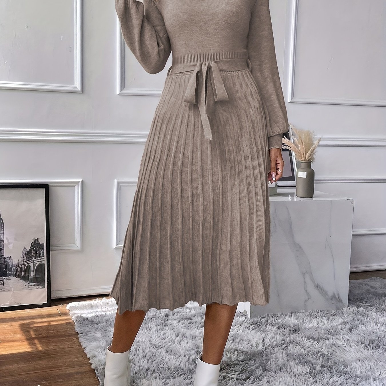 Solid Color Belted Long Sleeve Dress, Elegant A-line V Neck Sweater Dress For Spring & Fall, Women's Clothing