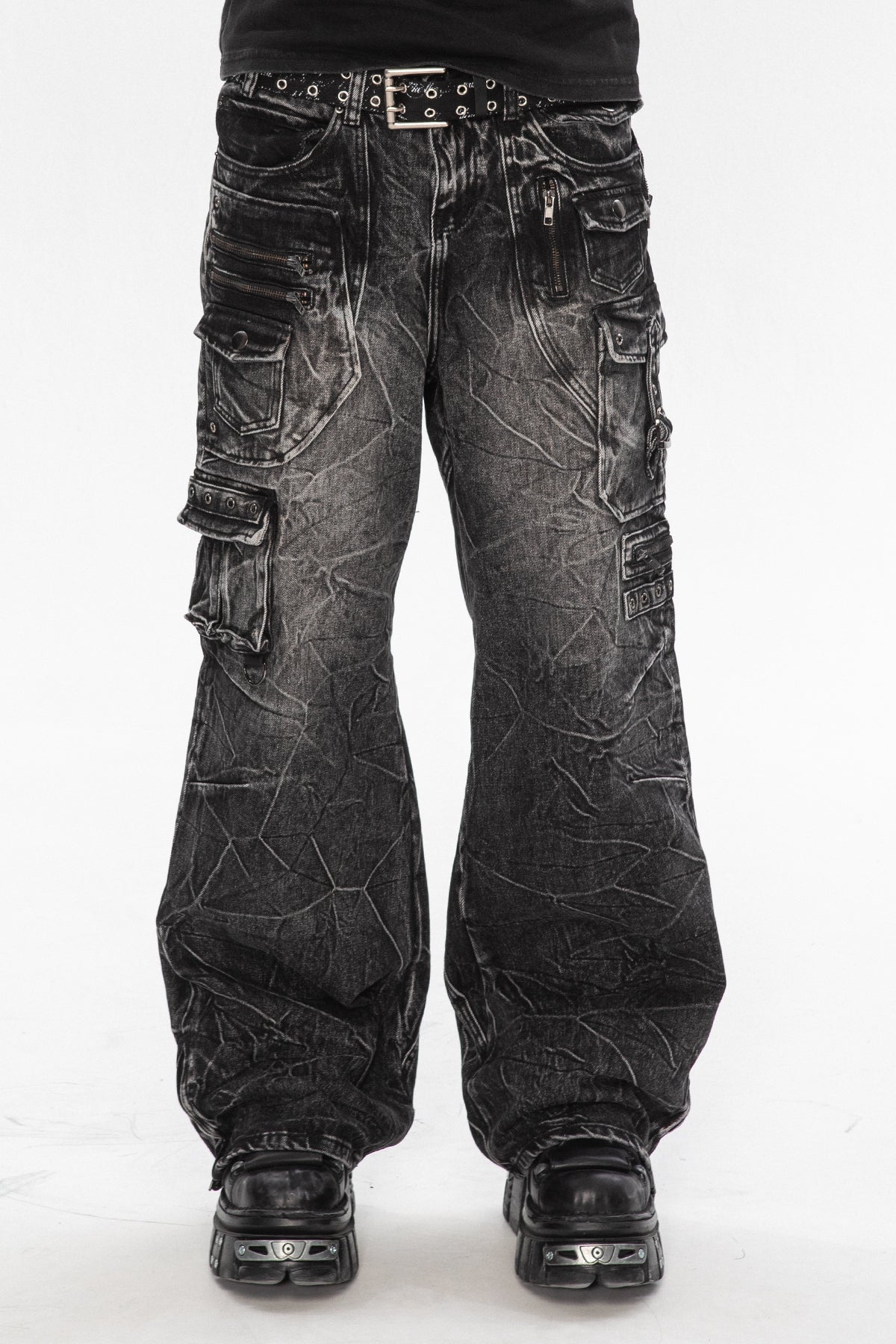 These jeans feature a distressed texture and fading throughout the front and back, with multiple cargo and zip pockets on both legs. Finished with a slight flare and a loose, baggy fit.