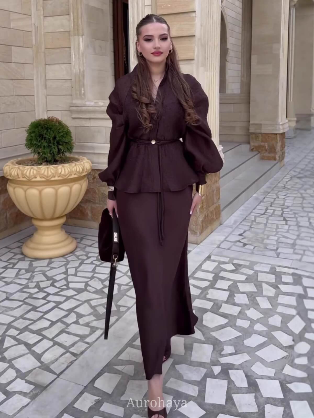 The top features a subtle V neckline, puffed long sleeves and a tie/adjustable waist that creates a tailored peplum effect — perfect for defining the waist while maintaining comfortable coverage. The coordinating high-waist skirt falls to a midi/maxi length with a clean, column-like drape that moves gracefully as you walk. Together the pieces form a versatile modest outfit suitable for work, smart-casual events, dinners, or religious gatherings.