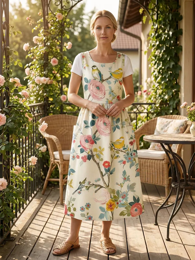 Vintage Beige-Base Bird & Floral Print Long Apron & Dress (2-in-1)