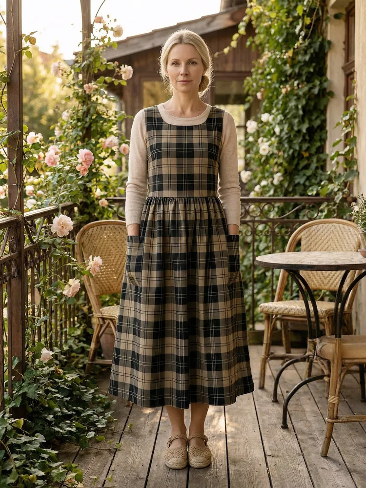 Vintage Black-Brown Plaid Long Apron & Dress (2-in-1)