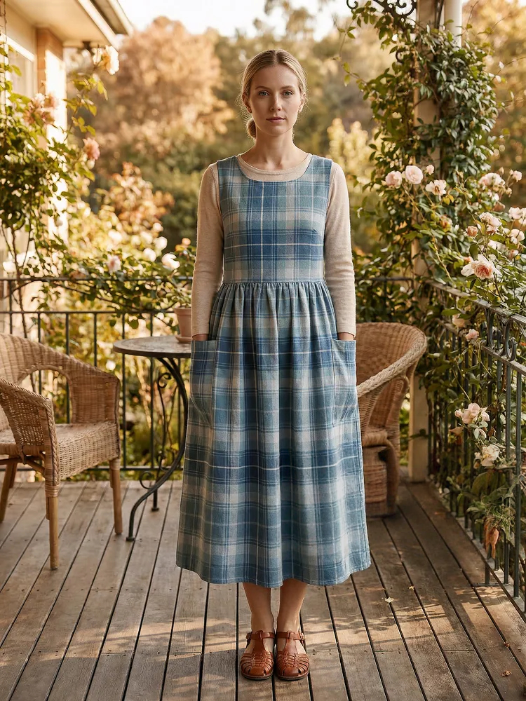 Vintage Blue Plaid Long Apron & Dress (2-in-1)