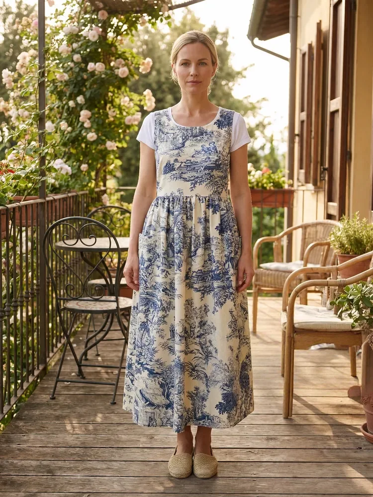 Vintage Blue & White Pastoral Landscape Print Long Apron & Dress (2-in-1)