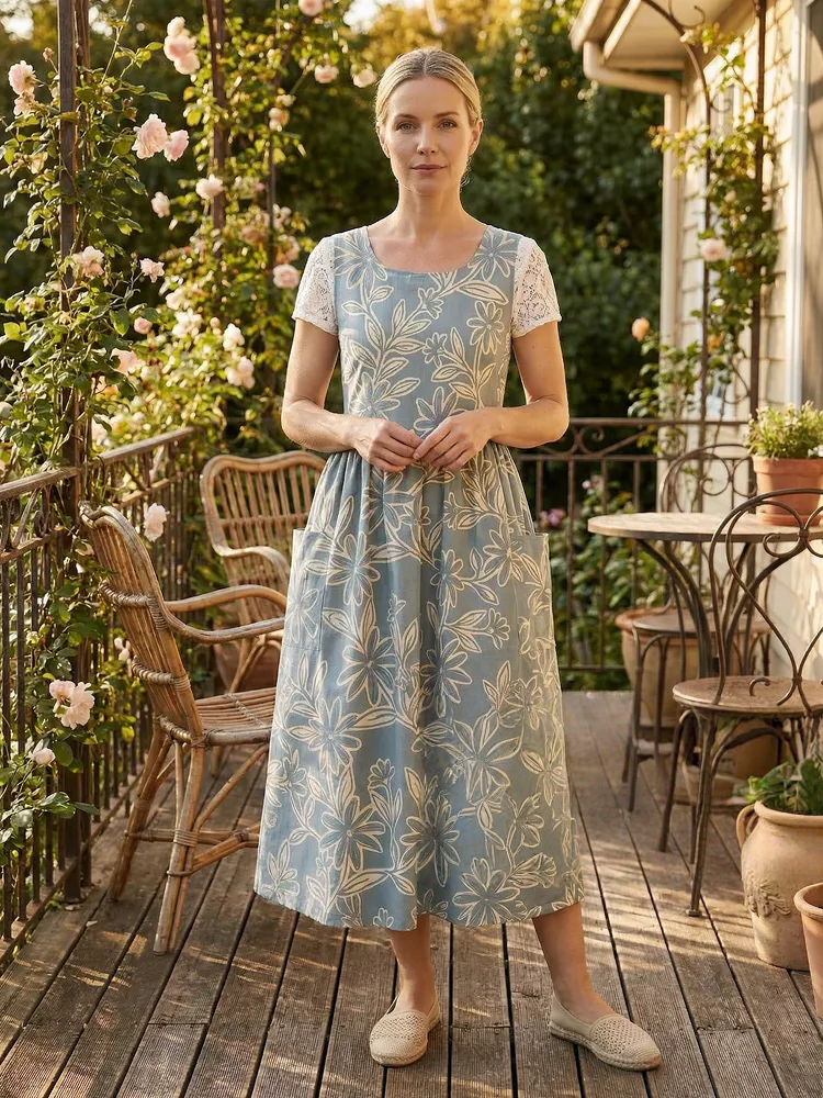Vintage Light Blue Hand-Drawn Floral Print Long Apron & Dress (2-in-1)