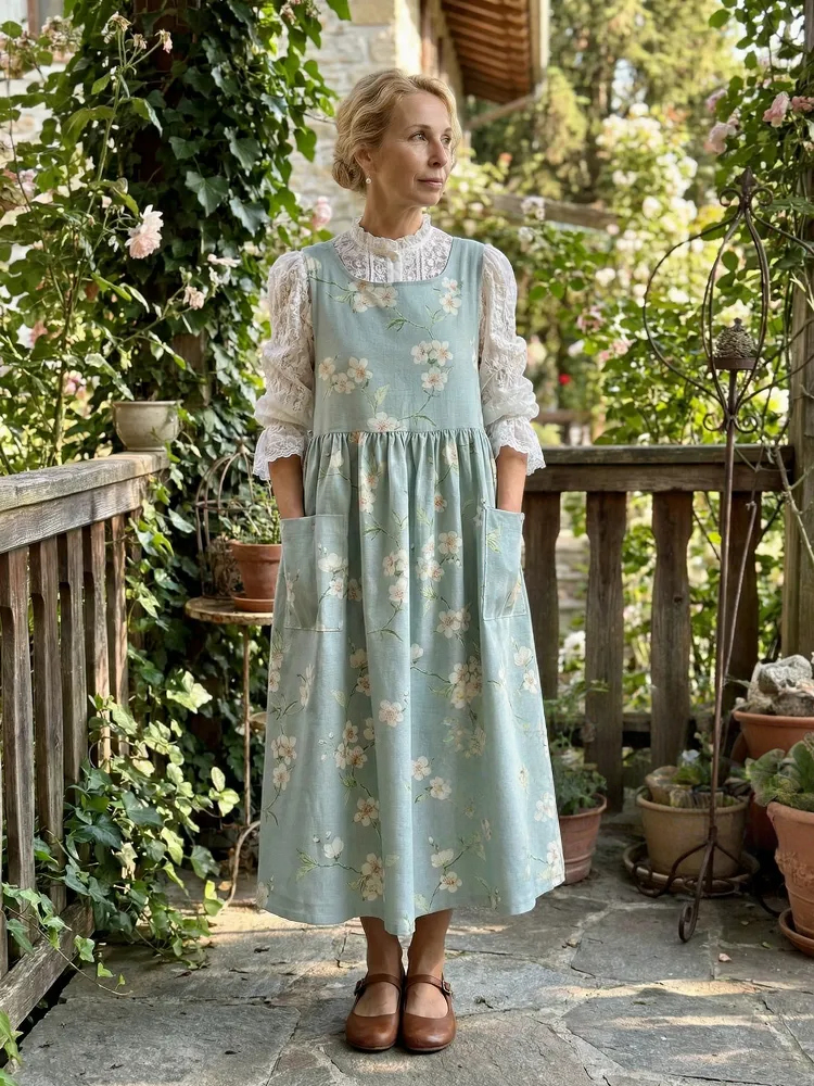 Vintage Light Mint Green White Blossom Branch Print Long Apron & Dress (2-in-1)