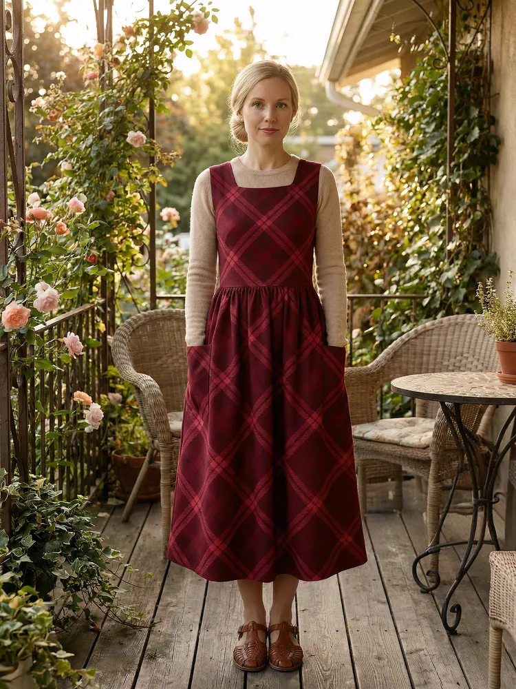Vintage Wine Red Argyle Plaid Long Apron & Dress (2-in-1)
