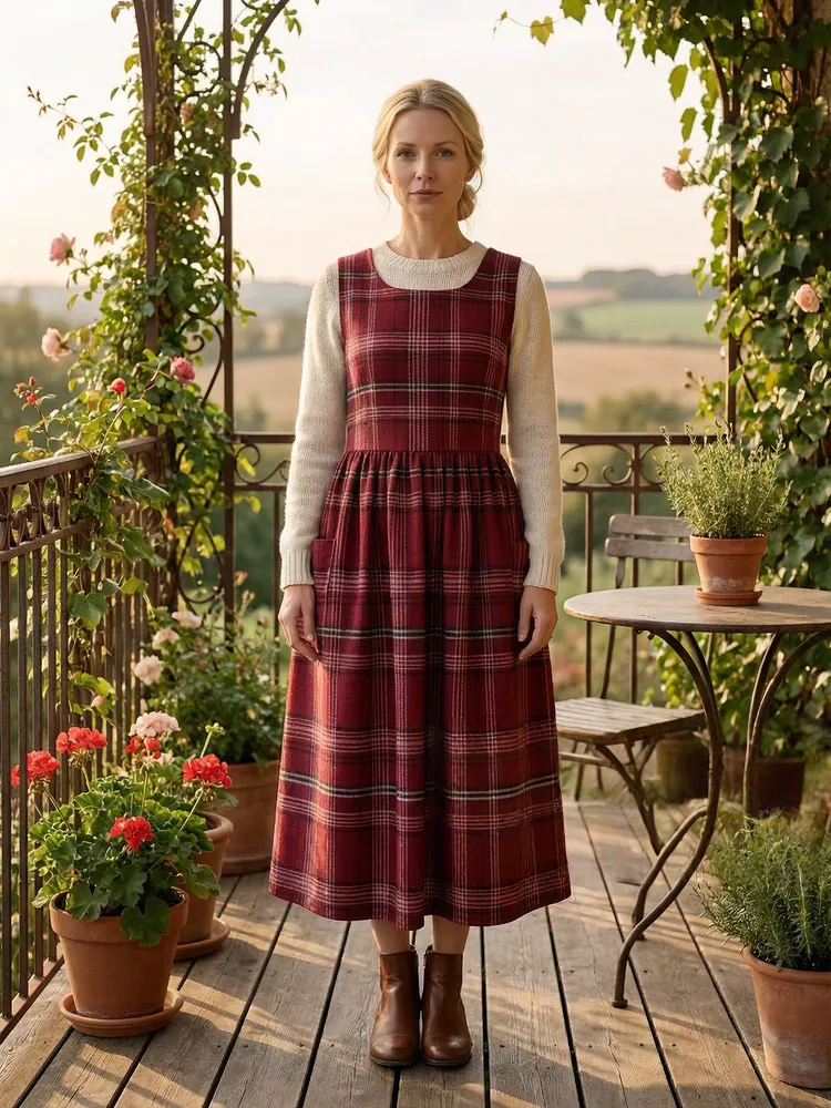 Vintage Wine Red Plaid Long Apron & Dress (2-in-1)