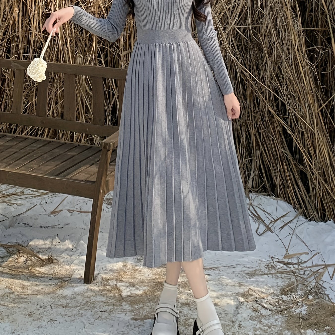 Women's Casual Cable Knit Pleated Sweater Dress - Wool Blend Long Sleeve Midi Dress with Button Detail and Flared Hem - Fall\u002FWinter Collection